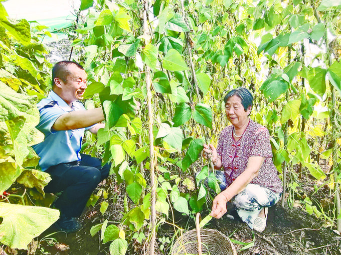 七月八日,駐東興村工作隊民警張福濱幫助村民在大棚摘豆角。王銳攝