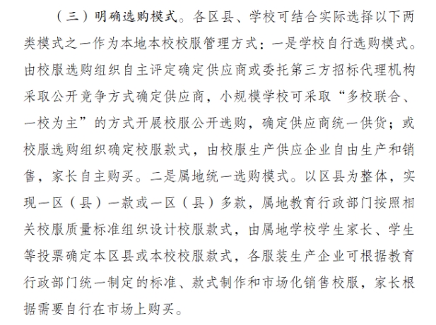 新規(guī)設(shè)計(jì)的“自行選購模式”靈活且務(wù)實(shí):規(guī)模較大的學(xué)校可自主評定供應(yīng)商或委托第三方招標(biāo);小規(guī)模學(xué)??刹扇 岸嘈B?lián)合、一校為主”的方式降低采購成本;甚至允許“確定款式后,由企業(yè)市場化生產(chǎn)銷售,家長自主購買”。新規(guī)嚴(yán)禁“定點(diǎn)”“定商標(biāo)”干涉交易,不得設(shè)置不合理入圍條件,確保所有合規(guī)企業(yè)都能公平參與競爭。