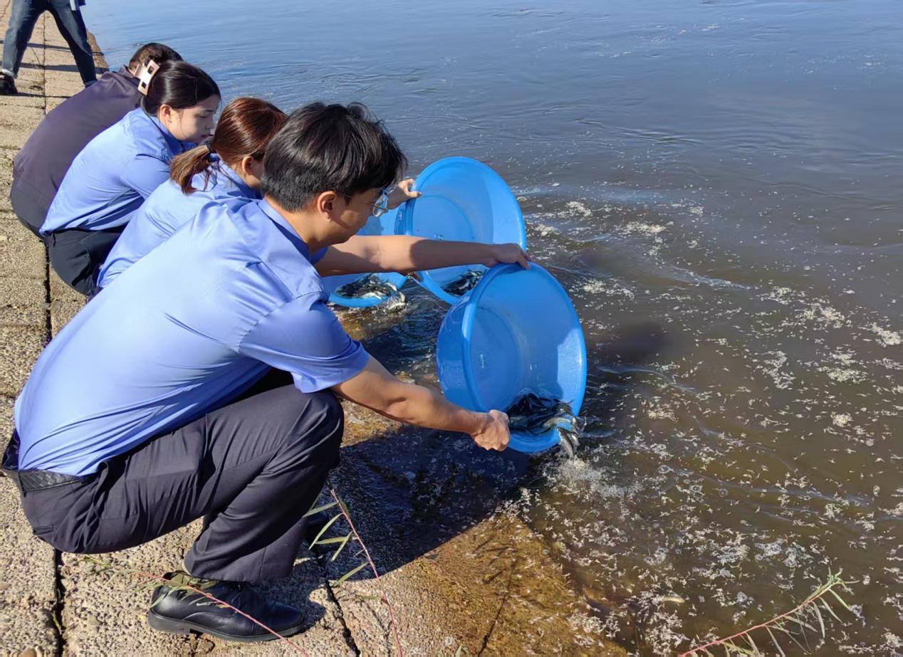 活動(dòng)現(xiàn)場(chǎng),工作人員拿起水桶,將草魚(yú)、鱖魚(yú)等魚(yú)種共230萬(wàn)尾魚(yú)苗投放進(jìn)河道中,此次放流魚(yú)苗生命力和適應(yīng)能力強(qiáng),能有效修復(fù)黑龍江河流域魚(yú)類種群數(shù)量,促進(jìn)各類水生生物結(jié)構(gòu)之間的平衡,實(shí)現(xiàn)“放魚(yú)養(yǎng)水、以魚(yú)護(hù)河”的生態(tài)效益。