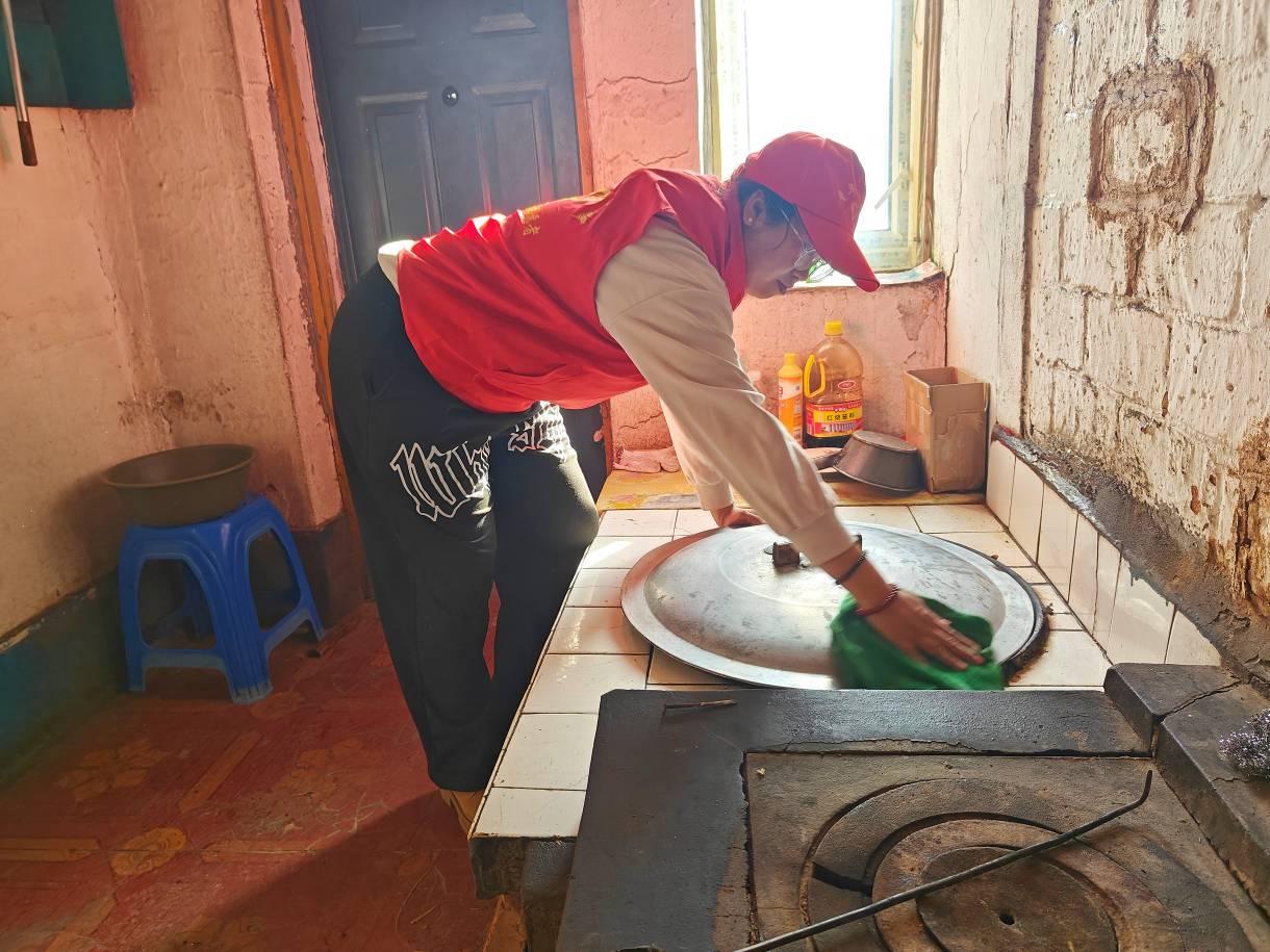 林場(chǎng)志愿者在幫助困難職工打掃衛(wèi)生(朱旭 攝)