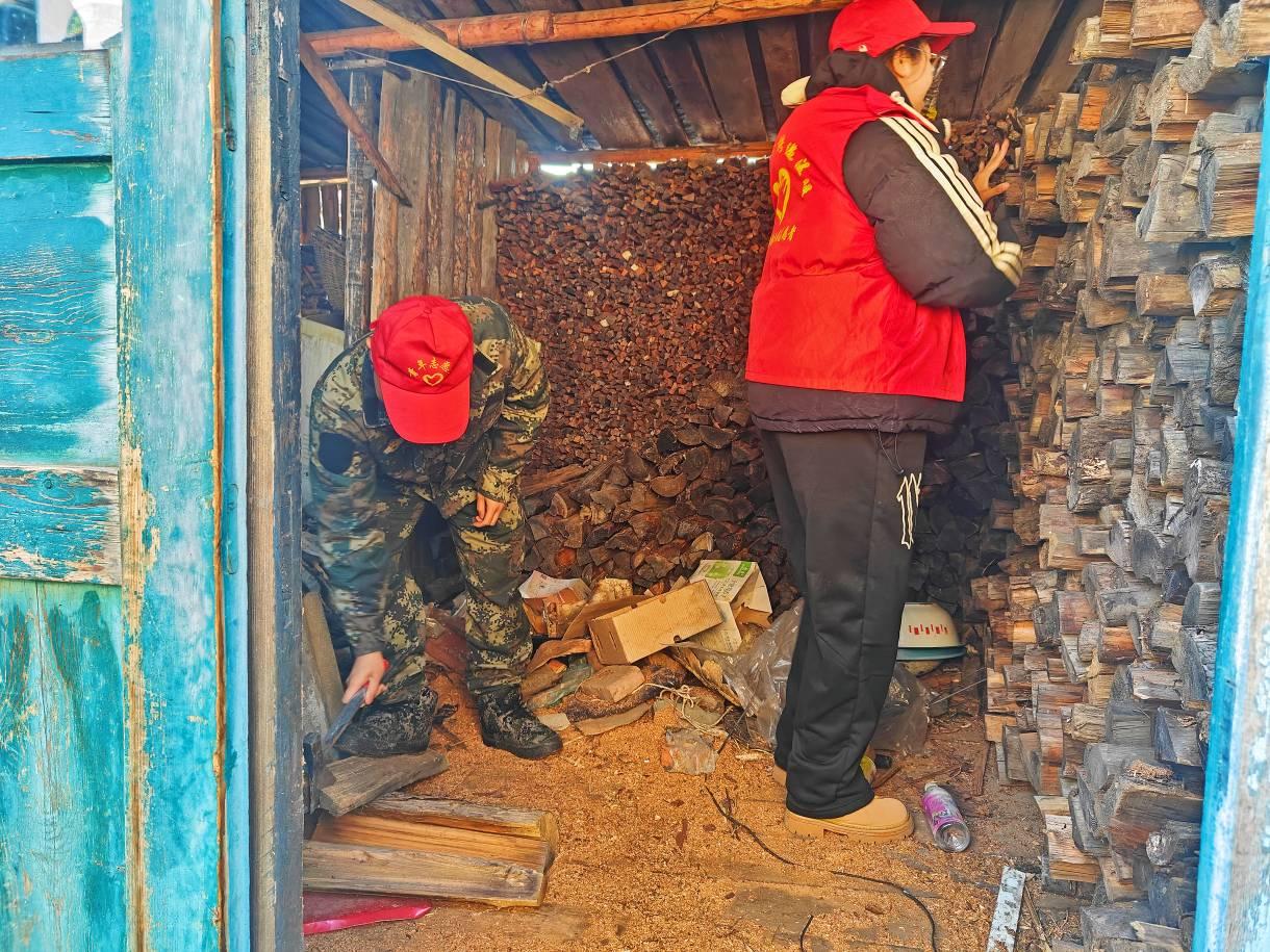 林場(chǎng)志愿者在幫助困難職工整理燒柴(朱旭 攝)
