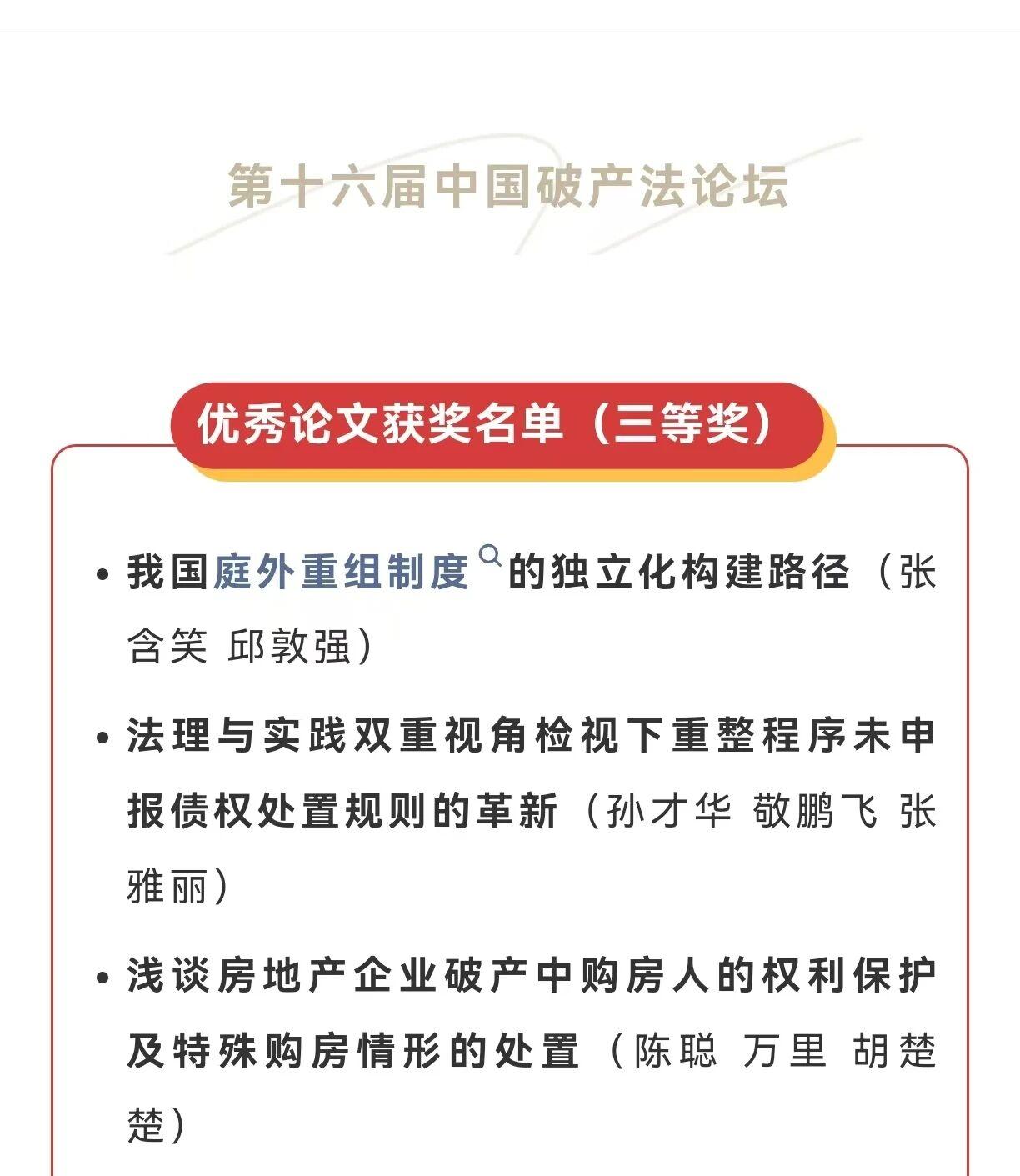 黑龍江經(jīng)濟網(wǎng)訊(董慧瑩 李雪松)近日,第十六屆中國破產(chǎn)法論壇在京舉辦。本屆論壇由中國人民大學法學院、中國人民大學破產(chǎn)法研究中心、北京市破產(chǎn)法學會、北京破產(chǎn)法庭共同主辦。經(jīng)過論壇組委會層層遴選及第三方專家評審,最終評出一等獎58篇,二等獎95篇,三等獎127篇,優(yōu)秀獎62篇。其中,肇東市人民法院黨組成員周麗華、立案庭法官助理李旭東、審管辦書記員王岳共同撰寫的論文《房產(chǎn)企業(yè)破產(chǎn)程序中預告登記法律效力研究》在1300篇論文中脫穎而出,榮獲三等獎。