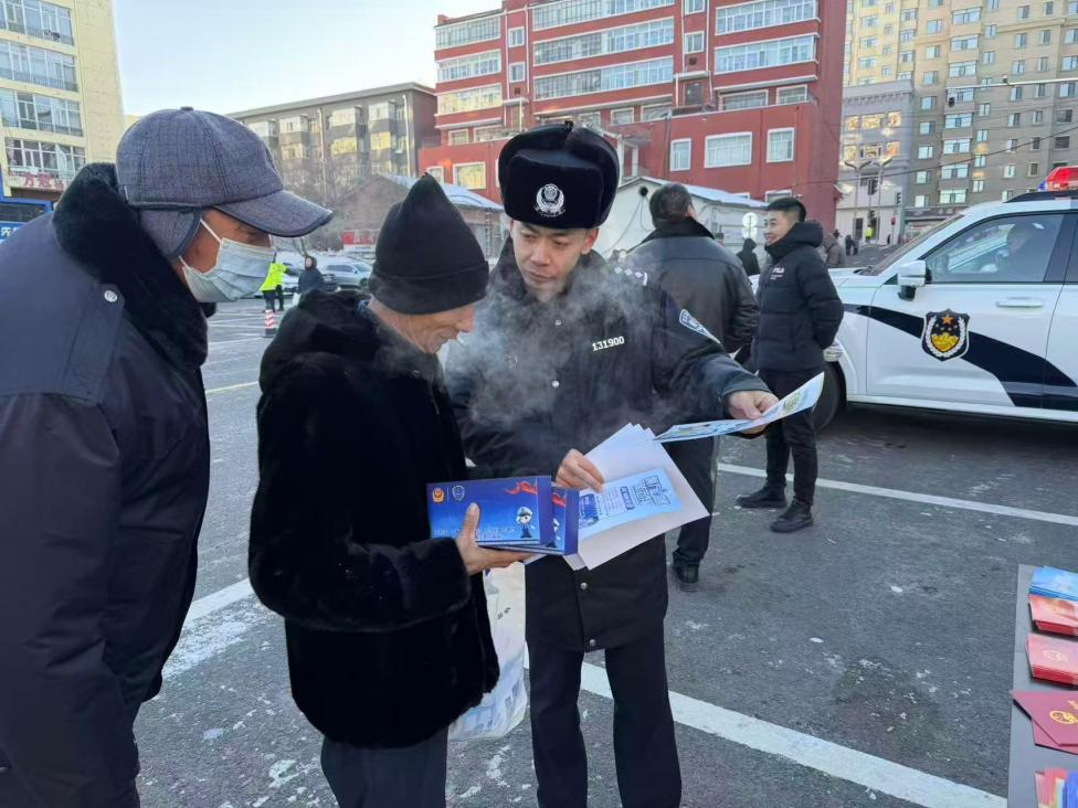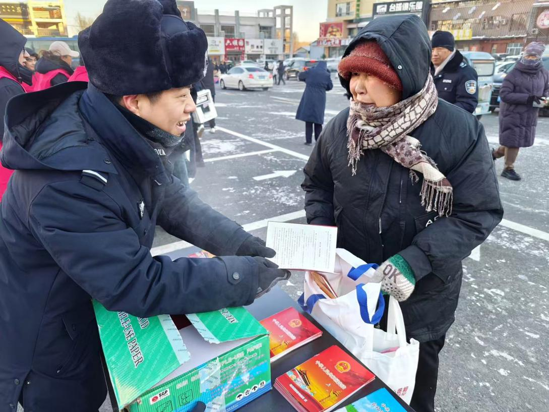 冰天雪地中,民輔警搓著凍紅的雙手仍微笑宣講,逐份發(fā)放《中華人民共和國憲法》讀本、法治折頁與防范指南?!斑@么冷的天還出來送法律知識,這些知識很實用,拿回去也讓家里人學(xué)學(xué)”,市民李大爺?shù)母锌莱隽巳罕娦穆?,現(xiàn)場咨詢、聆聽的群眾絡(luò)繹不絕,秩序井然。