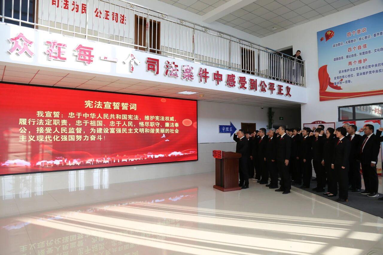 孫長久院長左手撫按憲法,舉起右拳,高聲領(lǐng)誓,各位干警莊嚴宣誓——“我宣誓:忠于中華人民共和國憲法,維護憲法權(quán)威,履行法定職責,忠于祖國、忠于人民,恪盡職守、廉潔奉公,接受人民監(jiān)督,為建設(shè)富強民主文明和諧美麗的社會主義現(xiàn)代化強國努力奮斗!”